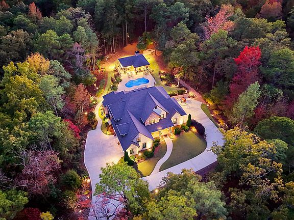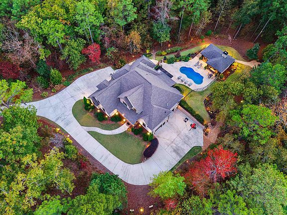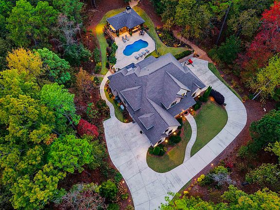 Elegant custom-built two-story full brick home with mortar smear finish, full basement, and sweeping lighted drive. A stunning outdoor pavilion features a full kitchen with stainless appliances, granite island, slate floors, gas fireplace, and half bath, overlooking a saltwater pool with heated pump room, outdoor shower, and firepit seating area. Inside, beautiful hardwood floors, soaring ceilings, crown molding, and multiple fireplaces create timeless warmth. The gourmet kitchen offers a gas cooktop, convection oven, breakfast bar, and coordinated granite throughout. The luxurious primary suite includes a sitting area, fireplace, marble accents, soaking tub, and dual walk-in closets. Upstairs, spacious bedrooms feature large closets and plantation shutters. The finished basement provides a wet bar, billiard room, and safe room. Surrounded by manicured, irrigated gardens and professional lighting, this home radiates craftsmanship and comfort.