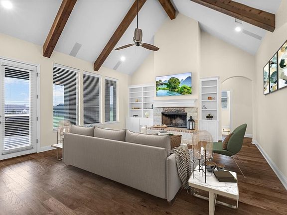 Welcome home to this beautifully designed 4-bedroom, 2-bath property with a dedicated office, set on a beautifully maintained 1-acre lot. Step inside to an open concept layout that seamlessly connects the living room and kitchen. The spacious living room features stained beamed ceilings, custom built-ins, surround sound, a curved TV that conveys and a cozy brick and stone wood-burning fireplace, creating the perfect spot to unwind. The kitchen is a true centerpiece with stainless steel appliances including a LG InstaView refrigerator, double ovens, granite countertops, and a large island ideal for casual meals or entertaining guests. A large utility room is already furnished with a washer and dryer and provides ample storage with built in cabinets and room for an additional freezer. The primary suite includes a trayed ceiling, TV that conveys, expansive walk-through shower, and an oversized closet. Step outside to enjoy the outdoor fireplace or relax in the Bullfrog Spa while watching the sunset in your fully fenced backyard, featuring surround sound and a patio TV already installed. The 3-car garage, also equipped with surround sound, features insulated doors and epoxy flooring for added convenience and style. With recent updates including fresh paint throughout, a new 7.5-ton HVAC with a 10-year warranty, gutters, and a front sprinkler system, this home is ready for you to move right in and start making memories. Special financing incentives available for using seller's preferred lender.