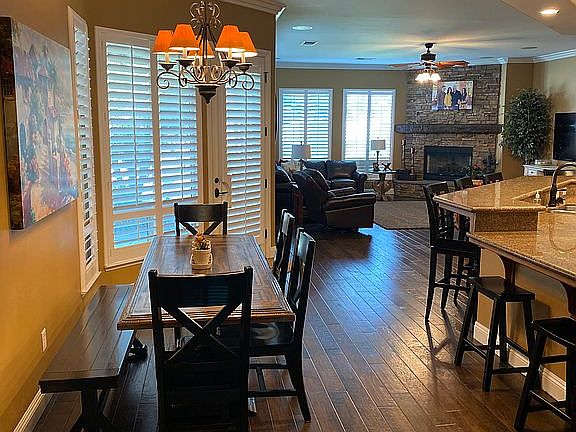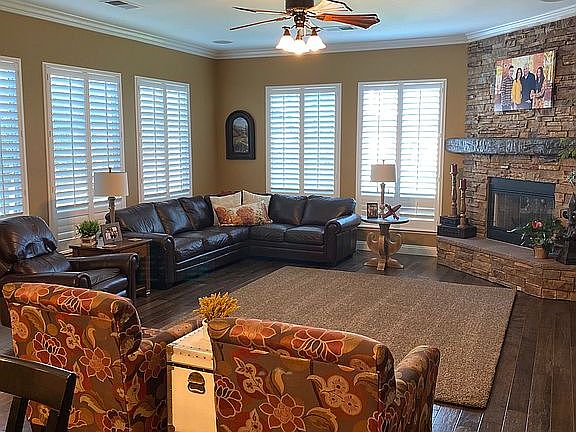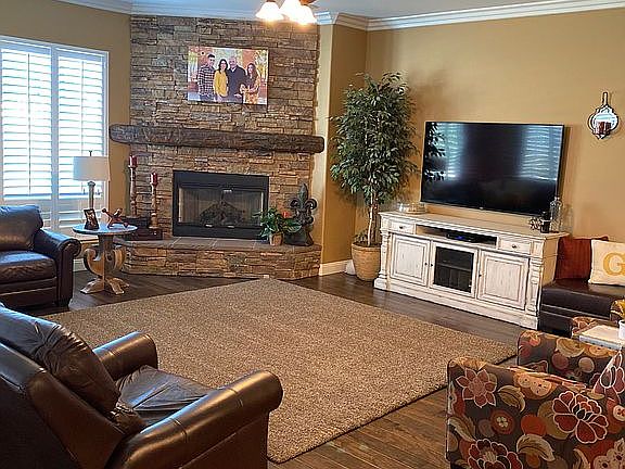 Wonderful Brighton Estates home on large lot. 3448 sq ft with 4 bedrooms, 3 baths plus a bonus room. Hickory hardwood flooring, plantation shutters and crown moulding. 3 car garage loaded with cabinets. Large kitchen with granite counters and stainless appliances. Spacious great room with floor to ceiling stone fireplace. A separate formal living area, nook and dining room are all easily accessible off the kitchen. This Tri-wing floor plan is ideal for a family. The Large Master with sitting area has a see thru fireplace that separates the master bath with large jetted soaking tub. The second wing hosts 2 bedrooms each with built in desks and jack and jill bathroom. The third wing is where you will find the laundry room, a guest bedroom, a bathroom as well as a built in desk area. Pebble-tec Saltwater pool with waterfall and slide. Large patio area with outdoor kitchen and remote controlled awnings. The big yard also has an in-ground trampoline.