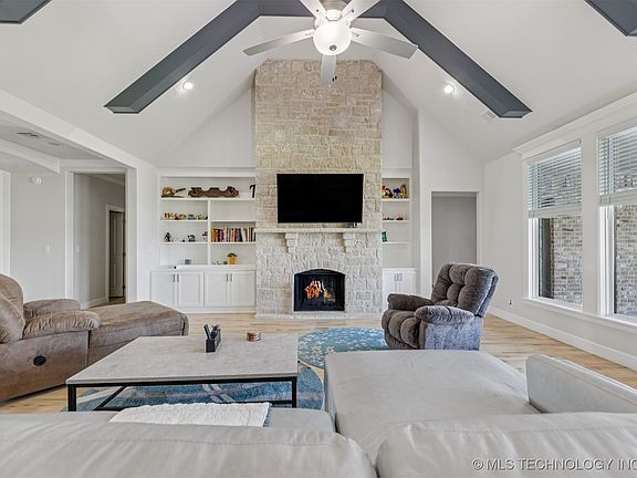 Newly built transitional style home with country living and several amenities nearby. Near Hwy 75 and minutes from Tulsa Hills and Downtown Tulsa. Loaded with premium finishes including wood floors, granite counter tops, custom built cabinets, soft close cabinets and drawers throughout, double ovens, stone fireplace, spray foam insulation, tankless water heater, surge protection throughout, and so much more! Beautiful yard with a spectacular pond view. Sprinkler system installed. Vinyl blinds, water softener system, drinking water system, and built in double ovens.