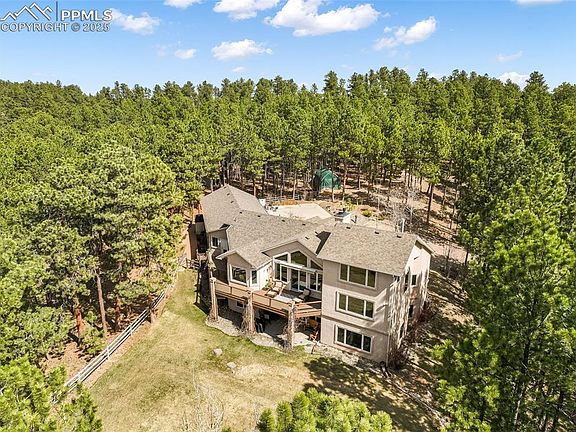 Welcome to one of the most beautiful and unique properties you'll find in Colorado Springs! Nestled on 6.51 fully fenced, treed acres with Pikes Peak views, this immaculately maintained & thoughtfully updated ranch-style home offers peaceful living with modern comfort. Step inside the light-filled main level where LVP flooring flows throughout. The fully renovated kitchen is a showstopper—complete with quartz countertops, stainless steel appliances, farm sink, newer cabinetry, island, dry bar, breakfast bar, & an expansive walk-in pantry. The convenient dining area, with a lovely view of the backyard, is perfect for enjoying everyday meals. The spacious great room is warm & inviting, featuring a cozy gas fireplace, a wall of windows showcasing the incredible views, & access to the composite deck. The primary bedroom is a private retreat with deck access, a large walk-in closet, and shares a gas fireplace with the renovated 5-piece bathroom. Tucked just above is a charming loft space with views of Pikes Peak—ideal for a home office or peaceful hideaway. Also on the main level: a formal dining room, stylish ¾ bath, a huge mudroom with garage & deck access, & a laundry room with storage closet. Downstairs, the finished walkout basement offers brand-new carpet, a large living room with wood-burning fireplace, kitchenette with laundry hookups, four generous bedrooms (all with walk-in closets), & two additional bathrooms. The outdoor features are just as impressive: concrete patio with hot tub prewire, fully fenced acreage with Ghost Control gate, separate fenced area for dogs, a poured concrete pad for RV parking or entertaining (with hookups and cleanout), chicken coop, & an oversized attached 4-car garage. Additional updates include a new roof (2024), cistern well pump (2024), and a newer furnace. This property offers the best of CO living—privacy, stunning views, & a home that feels both refined and welcoming. Come see it for yourself—you won’t ever want to leave!