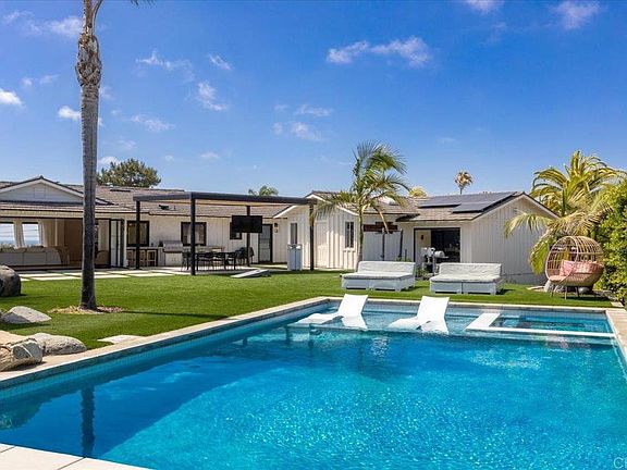 Tucked at the end of a quiet cul-de-sac in one of Coastal Carlsbad’s most desirable neighborhoods, 3170 Falcon Drive is a fully reimagined single-level estate offering effortless luxury, panoramic 180-degree ocean views, and modern design just minutes from the beach. Set on over half an acre, this home features a brand new pool and spa, expansive outdoor entertaining areas, and sleek, high-end finishes throughout. Inside, soaring vaulted ceilings and an open-concept layout connect light-filled living spaces with a designer kitchen anchored by custom cabinetry, a statement island, and a butler’s pantry for added convenience. Thoughtfully designed for modern living, the home includes an expansive laundry room, a stylish mud room, and new black metal-cased windows and doors that frame the stunning ocean vistas and enhance the seamless indoor-outdoor lifestyle. Each bathroom is a showpiece, with high-end materials and custom finishes that elevate every space. As a bonus, approved plans are in place for the completion of an ADU on an existing detached structure, offering flexibility for guests, extended family, or additional income potential. This is coastal living at its finest.