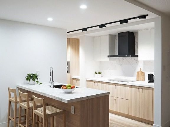 Brand-new custom kitchenSleek flat-panel cabinetsQuartz countersMatching backsplashStatement waterfall islandPot lightsModern track lighting