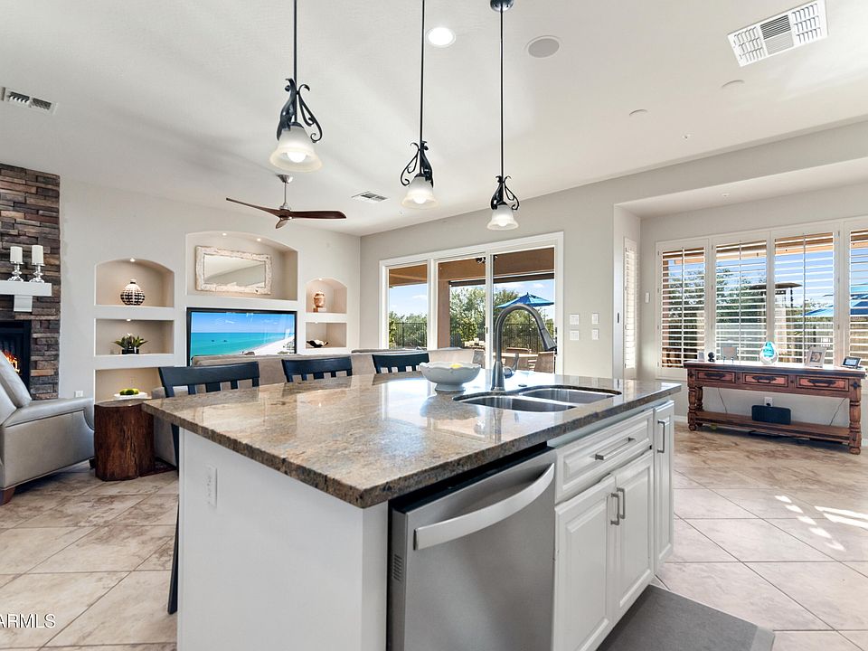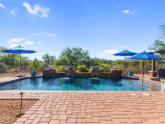 room in the basement. Gourmet kitchen overlooks large great room with high celiings, white cabinets, upgraded designer stainless hardware. stainless steel appliances, 5 burner gas range, GE Monogram fridge with new 20 ft glass slider GE Monogram built in refrigerator, large kitchen island overlooking large great room with lots of natural light. The family room offers a brand new 20 ft glass slider opening up to the gorgeous oversized shaded patio and stunning backyard w/ built in Pebbletec pool, spa, and relaxing waterfalls. The outdoor kitchen includes a sit up bar, beverage refrigerator, built in BBQ, prep sink, outside TV lounge, pergola, and commercial grade misting systems.FIVE MIN FROM TSMC. 20 Min to Basis Anthem and Basis Peoria. This home is loaded with upgrades including outdoor commercial grade Mist America misting system, 20 ft sliding glass door going into oversized shaded back patio, built in Gas BBQ with Bar and Oudoor Beverage sink and refrigerator. Outdoor TV with covered Pergola, 3 commercial grade remote control Awnings with outdoor lighting underneath, Synthetic Turf, Solar Panels, New Paint inside and out, New Upgraded Iron Front Door, H2O Concepts complete IN HOME WATER PURIFICATION SYSTEM. Sonoran Foothills Community Center offers tennis courts, pickleball courts, swimming pools, community center, clubhouse, children's playground and splash pad, dog parks, and many parks and walking / biking paths throughout.