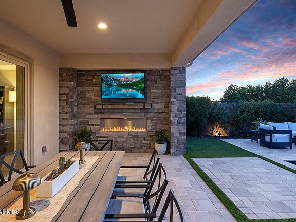 The backyard is a true showpiece, featuring travertine hardscape, artificial turf, and a heated saltwater pool and spa with Baja shelf and water features, along with a stunning linear stone fireplace with TV mount under the large covered patio. Backing to open space, the yard provides an expansive, private setting ideal for year-round enjoyment.