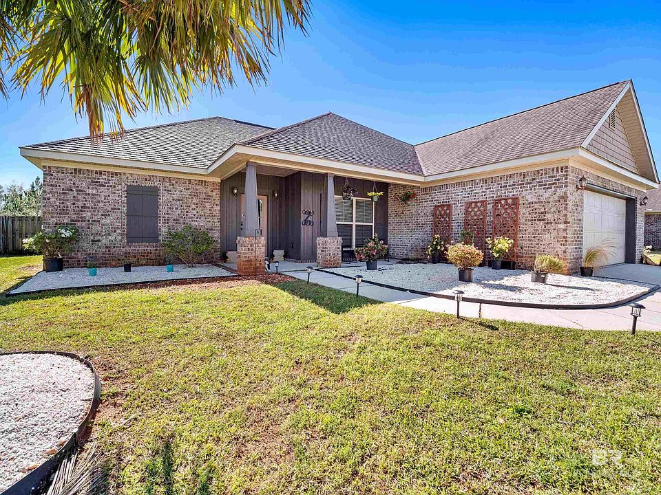 Tucked away from the hustle and bustle, Riverside at Arbor Walk is conveniently located near Foley, Magnolia Springs, and Gulf Shores, offering an abundance of dining, shopping, entertainment, and outdoor activities just minutes away. You’re also only 10 miles from the white sandy beaches of the Gulf. Newly refreshed front landscaping adds curb appeal to this 3 bedroom, 2 bathroom home featuring a split floor plan with 1,743 square feet of living space and a versatile bonus room. All bedrooms and the bonus room received new carpeting in 2023. Step inside to find freshly painted interiors, wood floors, crown molding, and recessed lighting. The kitchen boasts stainless appliances, granite countertops, tile flooring, and both a breakfast area and breakfast bar. The spacious primary suite offers a double vanity with granite countertops, a walk-in closet, a garden tub, and a separate shower. Elegant French doors lead to the bonus room, which can be transformed into an office, playroom, or whatever suits your needs. Venture outside to a fully fenced backyard where you can relax on the paver patio, gather around the firepit, or unwind in the covered, screened-in gazebo with built-in seating, power access, and a ceiling fan. Additional highlights include a fenced garden area, new uplighting and walkway lighting, and energy-efficient LED lighting throughout the home. A storage shed with power adds even more convenience for hobbies or extra storage. See for yourself why this could be the perfect place to call home! Buyer to verify all information during due diligence.