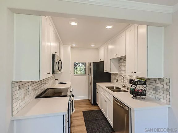 BRAND NEW upgrades though out beautiful condo in La Jolla. This downstairs corner condo offers brand new white cabinets, stainless-steel kitchen appliances, vinyl plank flooring, quartz countertops, custom paint, ceiling fans, mirrored closet doors, large bedroom closet, large patio, recessed lighting, crown molding and more. This east facing condo is easy to access from Via Alicante. Villa La Jolla offers 2 swimming pools, 2 Jacuzzi's, fitness center and clubhouse. It's just minutes to La Jolla Shores beach, UCSD & local shopping centers.