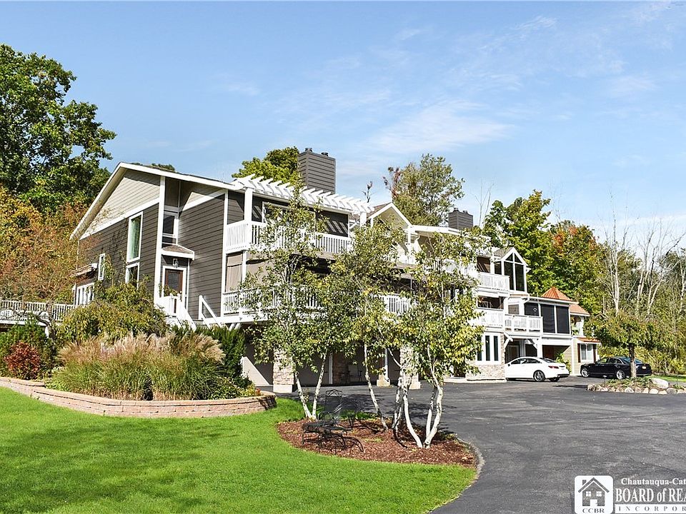 LAKEFRONT LUXURY TOWN HOME. Less than 5 miles from the village of Bemus Point. Beautiful views of Chautauqua Lake. Open floor plan concept. Fully updated. 3 large bedrooms, 2 full and 2 half baths. Large lakeview deck plus smaller deck off Master bedroom There is A bunk Room On Ground Level / Gym just off the garage. And A Half Bath . Great for extra room for Crafts or Office . Oversized 2 car garage. Private elevator shared between just 2 units. Fenced in back area off Deck , great for pets. Master bedroom has two California Closets . Hoa is $550/month and 9 acers of green space on Chautauqua Lake,The Park- like property and the beautiful lake views that will make you want to call it home. Pond with fountains and fire pit/island, Tennis Court, Shuffleboard, Lawn care, Landscaping, and snow removal and boat docking.