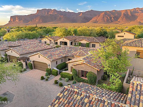 NEW PRICE - LOWEST PRICE PER SQ FT VILLA INSIDE THE GATES OF SUPERSTITION MOUNTAIN GOLF & COUNTRY CLUB. Furnishings negotiable. This exceptional property offers a seamless blend of elegance, comfort, and resort-style living. The main home spans 2,190 sqft., featuring 2 spacious bedrooms & 2 beautifully appointed baths. Its open-concept design unites the kitchen, great room, & dining area into a bright, inviting space—perfect for entertaining or simply relaxing. The kitchen showcases granite countertops, Viking appliances, and thoughtful finishes throughout. A newer 1,440 sqft guest casita was added to graciously accommodate out-of-town visitors, perfect mother in-law suite, offering a great room, kitchen, dining area, 2 bedrooms, 1 full bath, and an additional half bathensuring guests feel right at,home. Step outside to a thoughtfully designed back patio, complete with a built-in BBQ, tranquil waterfall, and cozy fire pit ideal for quiet mornings or evening gatherings under the stars. Located just a short walk to the fitness center and clubhouse, this property places you at the heart of endless activities. Enjoy two Jack Nicklaus-designed golf courses, or if golf isn't your passion, explore bocce, pickleball, tennis, hiking trails, and a variety of community events. You will love it here! Club amenities are available under a separate agreement. All pertinent information to be verified by the buyer.