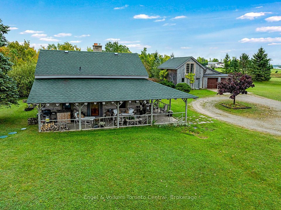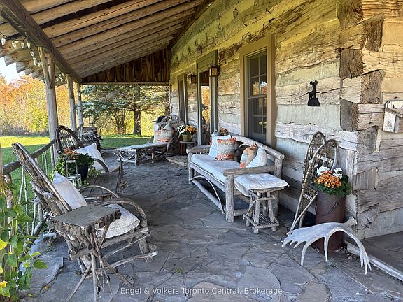 Rustic charm meets nature's serenity! Situated on 5.3 acres, just south east of Meaford, this home was reconstructed on this site, bringing together a local heritage dwelling with a cabin from Quebec. The current owner oversaw this reconstruction, insisting on strict adherence to detail. Over the years, modern influences were added but not at the expense of history. This special home offers two bedroom and 2 baths, with a loft above the living room that could be used as a third bedroom or home office. A flagstone entrance and hand finished wooden floors add to the historical charm. The open concept kitchen/dining area lends itself to family gatherings and intimate dinners. The two-sided fireplace services both the dining area and living room. The primary bedroom and ensuite and a second bedroom are located on the second floor. The owner has carefully chosen furniture and accessories to enhance the character of the residence. A wrap around covered porch borders the house on two sides, adding outdoor sitting area for entertaining or relaxing. Steps away from the house is the studio--another historical building that, with renovations, would increase the living space on the property. Attached to the studio is a double car garage. The property has many features---a pond, aerated by an authentic windmill, a ravine with trails and mature oak and maple trees, and pastoral vistas that add to the serenity of this uniqueness of this place. The property is situated between Meaford and Thornbury, just a short drive to the many special activities taking place in these communities all year long. This property is ideal for both full time living and a perfect weekend retreat. Skiing, boating, golf, biking and hiking are also closeby. This is truly an ideal place to enjoy the lifestyle that the Georgian Bay area has to offer.