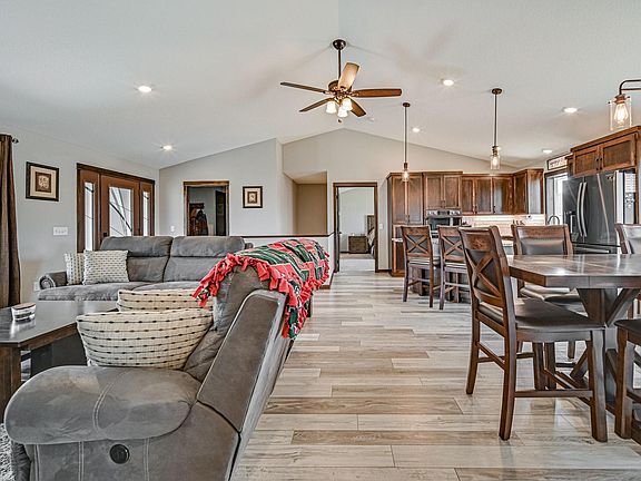 Beautiful like new Rambler on low traffic cul-de-sac. 3BR/3BA with heated and insulated huge oversize and deep 4-car garage. You will be impressed with this sought after rambler design with all living facilities on level, primary ensuite with tile bath and shower and walk-in closet. The other 2 BR's on the main level are setup Jack-n-Jill style with a full bath with tile floor. Main living area is vaulted and open concept with recessed lighting, ceiling fan, granite kitchen counters, lots of custom cabinets, black stainless appliances, marble backsplash in kitchen, dining room with patio door, and a covered front porch. There is also a large mud/laundry room with 1/2 bath. Wide open lower level is ready to finish with room for 2 more BR's, family room, bath, storage, bar area & utility room. Lower level is roughed in for in-floor heat also and is walkout to backyard. Home is right in the heart of lakes area & close to shopping, restaurants, parks, & more. Yard is nicely landscaped.