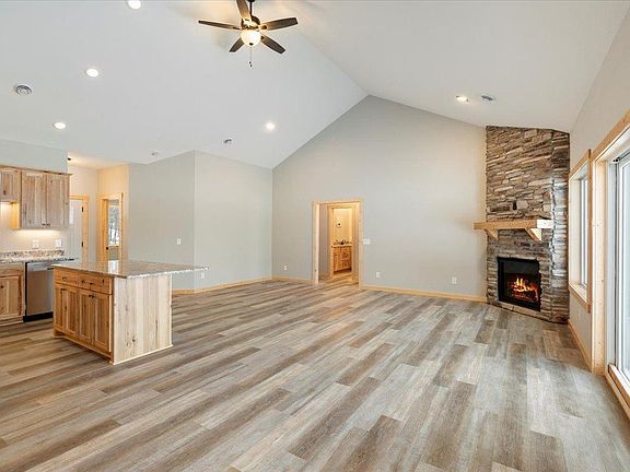 Step into this stunning new construction.... This Patio Home offers 4 bedrooms, 2 full baths and is situated on a 1/2 acre lot. The spacious primary bedroom has double closets, a private bathroom and is located on one side of home giving you much privacy from the other bedrooms. Inside, you'll be greeted by a stone, gas fireplace with block mantle that stretches up to the vaulted ceilings, creating a dramatic focal point. The natural woodwork and open floor plan enhance the spacious feel of this home. More features include transom windows in the bedrooms, wall of windows in the living room, large foyer entry, central air, paneled doors and ceiling fans in every room. The kitchen boasts granite countertops, stainless steel appliances, soft close distressed hickory cabinets/drawers, under cabinet lighting and an oversized kitchen island w/extra granite allowing more seating. The oversized bathrooms features granite counters w/dual sink & mirrors, bronze hardware accents & custom tile bath/showers. The exterior features Lp Smart siding with a modern color scheme and stone accents up the front. The front door includes an extra window, enhancing natural light and curb appeal. Gutters & the blacktop driveway ensures a sleek, polished look. The 3-car finished garage is heated, insulated & has carriage style doors with gridded windows as well as a floor drain, openers and a back yard service door adding both functionality and style. Enjoy the outdoors on the back concrete patio, which offers privacy with no houses behind you & a rock bonfire pit for those cozy evenings. This home is waiting for you!!