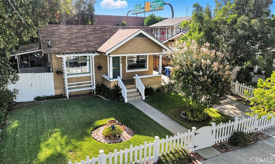 Craftsman bungalowColonial revival detailsTangerine fruit treePrivate backyard oasisTrellised porte cochereCross-gabled roofExposed rafter tails