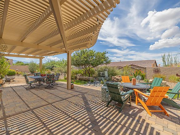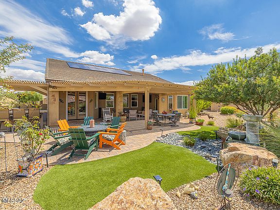 Gorgeous Artesa model on premium, elevated lot with common area to one side is situated close to all amenities while offering a spectacular rear yard plus Catalina views. This 2BD/2BA +Den (1,980 sq ft) split bedroom plan boasts energy-efficient Solar (builder installed), wood-look ceramic plank tile with carpeted bedrooms, wood shutters and rich-hued cultured marble bath vanities. Inviting foyer flows to an open concept Great room hosting walls of windows, media wall and upgraded fireplace w/ Travertine surround. Fabulous chef's kitchen features 2'' bullnose granite counter on enlarged island, matte SS appliances, electric induction stove, pecan cabinetry and butler's pantry with sink. Primary suite accessing rear patio is highlighted by large bay window, dual sink vanity, walk-in tiled shower and large walk-in closet while front guest room adjoins full hall bath. Spacious laundry room offers built-in cabinets. Insulated 2-car garage with 4' extension houses cabinets, water softener & utility sink. Retreat to a private, tranquil rear yard boasting wraparound pergola with sunshades, furniture quality gas BBQ island with refrigerator & linear fireplace, trickling fountain complemented by pebbled rock & boulders plus decorative turf lawn, meticulous landscaping and side yard offering lemon/orange/lime citrus trees. SaddleBrooke Ranch Active Adult Community offers outstanding amenities to welcome you home!