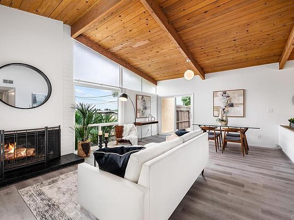 Your dreams have come true with this exquisite mid-century modern, single-level residence, nestled at the end of a serene cul-de-sac in the prestigious La Jolla Scenic Heights community. This 1960s vintage gem was designed by developer Leonard Drogin and architect William Krisel of the renowned firm Palmer & Krisel, offering an exceptional blend of timeless elegance and contemporary comforts. Spanning 1,676 square feet of thoughtfully designed living space, the home features stunning high beamed ceilings throughout. As you step inside, you're welcomed by an open, airy floor plan that seamlessly connects indoor and outdoor living. The residence includes four generously sized bedrooms and three well-appointed bathrooms, along with a bonus room that could serve as a fifth bedroom, office, or whatever best suits your needs. The primary suite is a tranquil retreat, with an en-suite bathroom and direct access to the outdoors. The heart of the home is the sophisticated living area, where large windows flood the space with natural light, highlighting the clean lines and architectural details that define mid-century design. A cozy fireplace adds to the charm. The kitchen is a chef’s dream, ideal for both culinary creations and entertaining guests. It, along with two bathrooms, has been beautifully remodeled. Outside, you'll find a meticulously landscaped 9,800-square-foot lot, offering ample space for relaxation and recreation. The spacious patio areas provide the perfect setting for al fresco dining and gatherings, while the front yard offers scenic city views. Additional amenities include a convenient laundry room, a two-car garage, and ample RV and boat parking. The yard is a blank canvas with plenty of room for a pool or an accessory dwelling unit (ADU). Located near shopping, dining, and just a short 10-minute drive to La Jolla Shores beaches, this home presents a rare opportunity to own a piece of architectural history. Experience refined living at its finest in this remarkable residence. WELCOME HOME!
