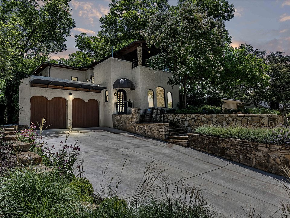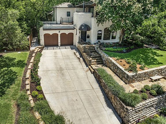 This immaculately updated and preserved 1938 Santa Fe-style home blends timeless character with thoughtful updates, just blocks from TCU and under a mile to Colonial Golf Course. Perched on an oversized, tree-filled lot, the property boasts lush, meticulously landscaped grounds and sweeping westward views of Fort Worth—best enjoyed from the covered rooftop patio. A true standout feature: the 12-inch thick Texas limestone walls, both inside and out, offering unmatched charm and a quiet retreat from the outside world. Step inside to a warm, inviting living and dining area anchored by a striking custom stained glass window and framed by a vaulted pine ceiling.