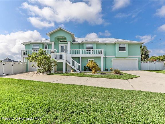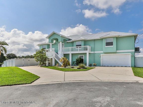 Ready to wake up in paradise every day? Because this beauty could be your ultimate waterfront oasis or an income-generating destination! Two stories of custom-built majesty await at the end of a cul-de-sac in Hernando Beach. A new metal roof in 2019, newer elevated AC units in 2014 and 2016 are just a few of the upgrades here. Main living on the second floor is accessed via the stairs or the newer elevator with a backup battery. An open floor plan with high tray ceilings, newer waterproof Coretec luxury vinyl plank flooring throughout, newer ceiling fans, designer light fixtures, and killer views on every level feature prominently. 12 ft pocket sliders in the dining room open to a covered, screened balcony that looks out over the canals. The remodeled kitchen is catalog-worthy with newer granite on the center island and recently repainted and resurfaced cabinets, plus Corian counters; a tile backsplash; a giant walk-in pantry with a dumbwaiter; and stainless steel appliances that include an induction cooktop, vent hood, and a trash compactor. The primary bedroom has private access to the screened balcony, double walk-in closets, and the cutest barn door leading to the ensuite bathroom. Completely renovated, it boasts newer dual sink vanities, a separate shower with a stone floor, and a gorgeously tiled jetted tub. The remaining two guest bedrooms have their own walk-in closets; one has a large window seat, and the other, a set of sliding doors that leads out to the newly decked veranda. A sizable bonus room with window seat storage could easily be an office or 4th bedroom; the washer/dryer hookups are in the closet there, too. Explore the possibilities in the finished area on the ground floor, which has an expansive open space, plus a smaller private room and a half bath for the ideal in-law suite. It's connected to both of the garages downstairs; there's also a workbench in the double bay and a newer sub panel wired for a backup generator with whole house surge protection and a 50 amp RV hookup. The amazing outdoor space is made for entertaining! A screened birdcage covers the entire rear patio, encompassing the second story. Brick pavers line the patio and extend to the sunning deck, where you'll find a custom-built solar heated saltwater pool system, complete with waterfalls, plus automatic fill and automatic overflow features. The backyard is fully fenced and includes a separate dog run. Use the newer floating dock and kayak launch to hit the waterways for an afternoon of paddling. Or the public boat lift is a short trip down the canal system for larger craft. There are too many incredible features to include here, so ask your agent for the full feature sheet. This home is the epitome of luxurious living on the waterfront. Make it your permanent getaway today!