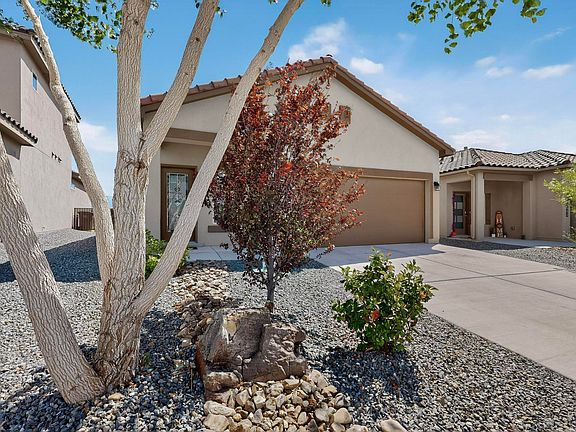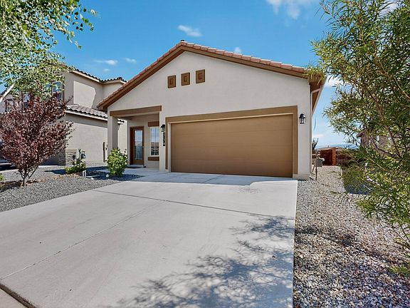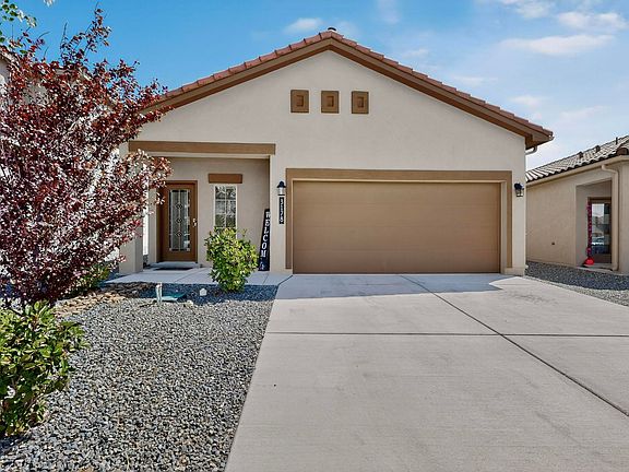Welcome home to your turnkey D.R. Horton home in the desirable community of Los Diamantes! Home features 3 bedrooms, 2 full baths with open floor plan and modern design. Walk into the larger Scarlette floor plan with granite countertops, SS appliances with upgraded French door refrigerator, tile backsplash and tile floors throughout family room. Large primary bedroom with walk in closet with shelf system, frameless glass shower and marble double sinks. From the bedroom step out to your maintenance free xeriscaped backyard which is the perfect place to enjoy views of the sandia mountains on your paved patio. Other upgrades include gas line connection for grill, blinds and gutters. Home is in great location near shopping, restaurants, rust hospital and more. Schedule your showing today!