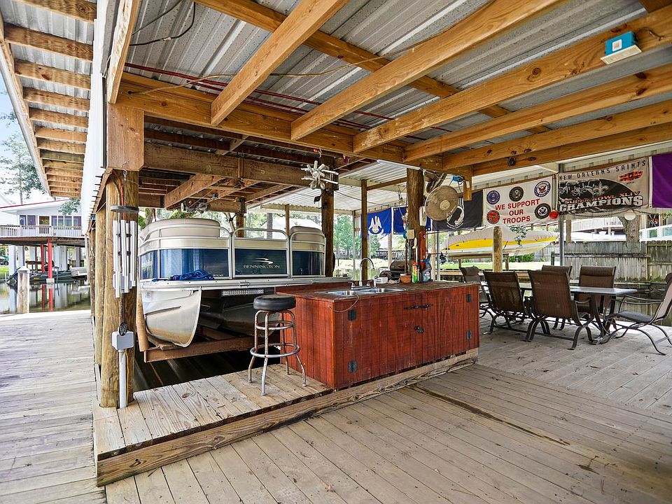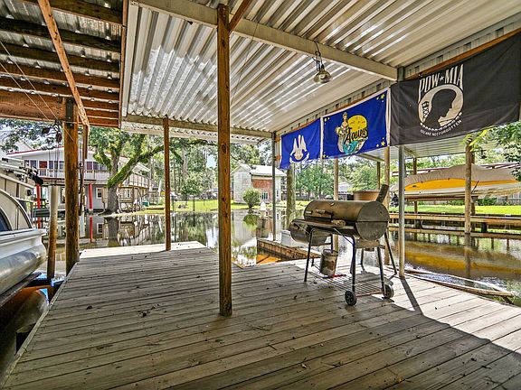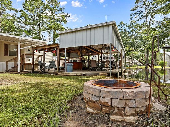 Adorable 2 bed 1 bath water front property--great for anyone looking for a quiet, cozy weekend getaway. Situated on two full lots, this property offers a covered boat house with lift equipped to accommodate a pontoon boat up to 25', large covered deck, covered RV parking, additional boat slip capable of accommodating a 40' boat, 12x24 shed, plenty of parking, including city water and sewer. All inside furniture, appliances, & self propelled lawnmower to remain. This one won't last long.