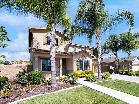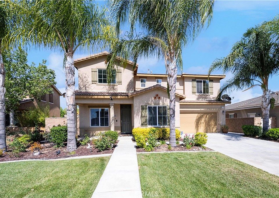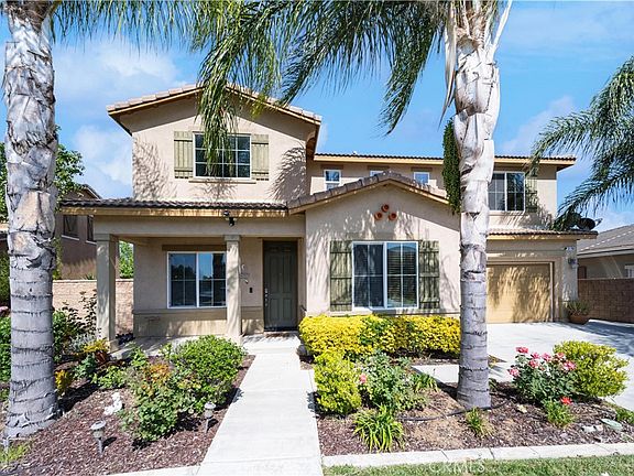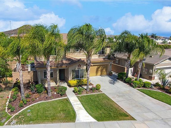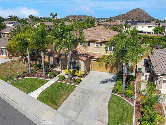 This very well kept beautiful home is situated in a quiet neighborhood in a cul-de-sac. Just as you are walking towards the house, you will see the manicured landscape, shrubs, roses and palm trees. It has an expansive driveway. As you get to the front door, you will be welcomed to the front porch and Ring camera. When you open the front door, you will see the spacious living and dining room with high ceiling. This room and downstairs bedroom has carpet. The rest of the first floor has tile flooring. When you walk to the right, you will immediately see a bedroom and full bathroom. Then can go straight into the Family Room that has a fireplace, five speakers surround sound, big windows that gives natural light. Right away, you will see the stunning open concept kitchen with granite counter tops, island with sink, stainless steel appliances, double door pantry, plenty of cabinets and storage. Also reseeding lights, dining area and door with screen that goes into the garage. The microwave and dishwasher are fairly new under two years. It has a tandem three car garage. If you go upstairs, you will see carpet throughout the hallway and bedrooms. As you come to the top of the stairs, you will see a good sized loft that has an opening, so you can see to the first floor. There's 4 bedrooms upstairs and 3 full bathrooms. One of the bathrooms is a Jack-N-Jill. The bathrooms and laundry room have vinyl flooring. When you enter the Main bedroom ensuite, you will see how spacious it its and has big windows that give natural light. As you enter the Main bathroom, you will see the double sink with granite countertop, large walking closet, tub and walk-in shower. Every bedroom and family room has fans. All the light switches in the house have dimmer switch. It allows you to adjust the brightness of the light fixture, offering a range of illumination levels instead of just on and off. It has an ADT alarm system. The backyard is beautifully landscaped with real grass, concrete, palm trees, plants and sprinkler system (front and back). It has solar and no HOA! It's close to shopping centers, park, Mt. San Jacinto College and 215 Freeway. This house could be your new home!