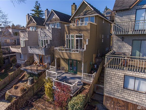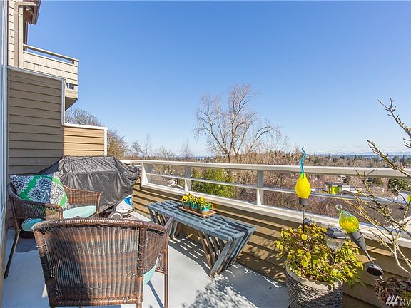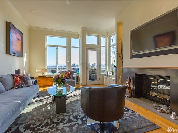Panoramic views of the Cascades and Madison Valley, from all 3 levels! Meticulous contemporary features soaring 10' ceilings in the open living rm w/hardwoods, wood FP and recessed art niches. Updated kitchen w/gas range, pantry, and a thoughtful design of the formal dining.Top floor master suite w/spa like bath/heated flrs, separate tub & shower, walk-in closet and mahogany built-ins. Lower bedrooms/bath for guests or office. Low maintenance patio/gardens & 3 decks. Best location for commuting!