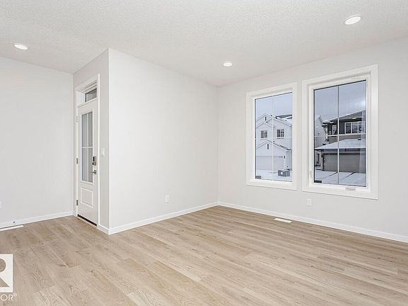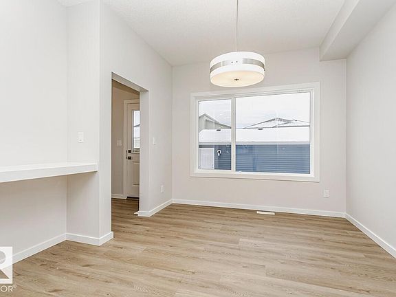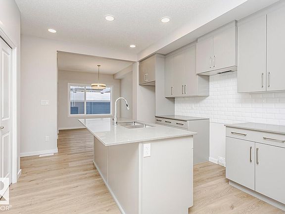 This thoughtfully designed home features a private side entrance to the main floor, offering flexible use. The open-concept main floor includes a spacious great room, central kitchen with pantry, and rear dining area, ideal for everyday living and entertaining. Luxury Vinyl Plank flooring runs throughout the main floor and bathrooms for a durable, low-maintenance finish. The kitchen and bathrooms are finished with quartz countertops, undermount sinks, and soft-close cabinetry. Upstairs offers three bedrooms, including a primary bedroom with walk-in closet and ensuite featuring dual sinks and a glass-enclosed standing shower. The second bedroom includes a walk-in closet, and an upper-floor laundry area with separate linen closet adds convenience. A double detached garage completes the property.