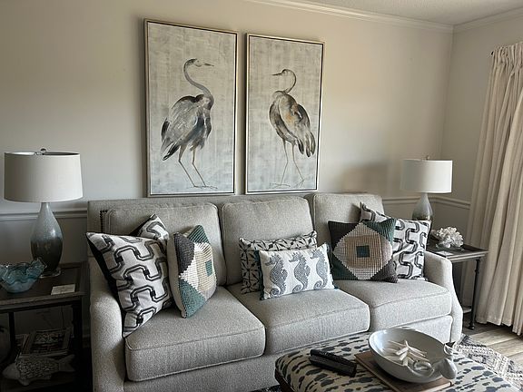 Completely renovated and Beautifully furnished, this gorgeous 2BR/2BA condominium has spectacular views of the marsh with a very large wrap around deck. Imagine marsh views from both of your decks -upstairs and down ! *(UPSTAIRS MASTER AND DOWNSTAIRS LIVING ROOM OPEN TO THE OUTDOORS VIA DOUBLE SLIDING DOORS). This private, end unit Marsh-front condo, with stone surround fireplace, has two bedrooms upstairs with very spacious walk-in closets & two separate 'Jack & Jill' sink areas that adjoin in the commode/shower/tub shared between bedrooms. The Richly decorated Master Bedroom features a king-sized bed and its own walk out veranda. The light and bright Updated kitchen features granite countertops, stainless appliances & subway tile backsplash. Tile floors downstairs make for easy clean up. Downstairs 2nd full bathroom also contains a stackable W/D. The Mid-south island location makes biking to Village or beach possible. This Special property is an Absolute MUST SEE - and DECORATOR'S DREAM !! Custom metal pipe curtain rods; new stone fireplace hearth; all new door black iron henge hardware and fixtures throughout. Front and rear exterior storage and is ideal for full time or part time use just across from the pool area.