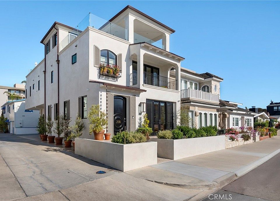 Welcome to 318 Coronado Street, a stunning custom-built 3-bedroom, 5-bathroom home located just two doors from the bay on the coveted Balboa Peninsula. This elevated corner residence offers panoramic views of the Newport Harbor, abundant indoor/outdoor living space, three-car parking (two-car garage plus an oversized carport), and a private elevator serving all three levels. The main level features a gourmet kitchen with a large island and high-end appliances, and a large great room that flows seamlessly out to a spacious front patio with bay views. A custom metal spiral staircase—paired with the elevator—leads to the second level with two guest suites, a laundry room, and a luxurious primary suite which includes a private balcony, dual vanities, soaking tub inside a walk-in shower, and a large walk-in closet. The show-stopping rooftop deck on the third floor spans two outdoor living areas: one with covered seating, a fireplace, TV, and wet bar, and the other with open-air lounging and views stretching from the ocean to Fashion Island - all perfect for al fresco dining and entertaining. This thoughtfully designed home blends refined craftsmanship with effortless beach living in one of Newport Beach’s most desirable locations.