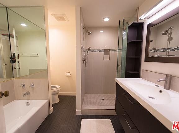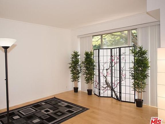 Live in the coveted 90210! Large 1 bedroom, 1.5 bath (plus make-up area with sink) Condo with an area for a den or office. New hardwood floors and remodeled master bathroom. Original floor-to-ceiling windows and sliding glass doors in bedroom and den area that open to an attached, private patio. Washer & Dryer in-unit. Corner unit with only 1 shared wall. Master Bedroom has a large walk-in closet and a 2nd closet for plenty of storage. Complex has a Pool, Spa and sun deck. Controlled Access building and secured gated parking with 2 tandem spaces