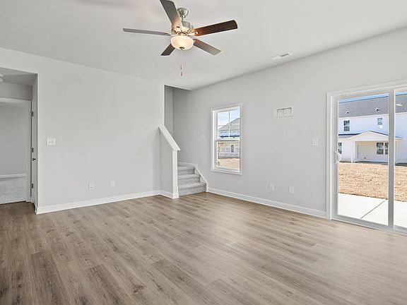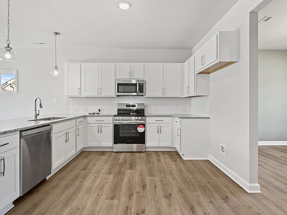Upon entering the home, a formal dining room painted in Sherwin Williams "Rare Gray" is located off the foyer with direct access to the kitchen.The entryway leads to a mudroom space that provides access to the garage and a convenient half-bath featuring a pedestal sink and oval mirror. The kitchen offers ample countertop space with granite countertops in "Santa Cecilia Light," a sink overlooking the great room, bar seating, white shaker cabinets, subway tile backsplash in "Arctic White" set in a brick pattern, a pantry, and stainless steel appliances including a microwave, dishwasher, and smooth top range.The open great room provides easy access to the grill patio through sliding glass doors. Off the great room, the spacious first-floor primary suite features a tray ceiling with crown molding, and the primary bathroom includes a large walk-in closet, dual sink vanity with quartz countertops in "Simply White," white shaker cabinets, a private water closet, linen closet, and a walk-in shower with tile surround. Upstairs, the second floor opens to a spacious loft with hall access to a linen closet, three additional bedrooms, a laundry room with washer/dryer connections, and a full bathroom with a vanity and a tub/shower combination with tile surround. Durable luxury vinyl plank flooring is found throughout the foyer, great room, mudroom, kitchen, bathrooms, and laundry room. The exterior features low-maintenance vinyl siding with shake accents, a stone skirt, dimensional roof...