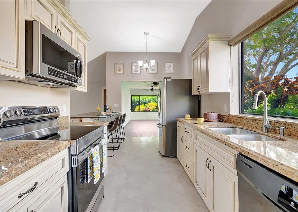 SENSATIONAL, UPDATED home features 2 BR/2Baths w/ oversized enclosed sunroom, ALL IMPACT WINDOWS & DOORS + 2 car Garage! 55+ living perfected. Screened entry porch opens to foyer welcoming you to WIDE OPEN FLOORPLAN! HUGE LR w/ soaring ceiling adorned w/ smooth finish. Neutral CONSISTENT, tile flooring in LA. Entertaining is a breeze in your BIG chef's kitchen boasting SAMUNG S/S appliances, tons of cabinets &/picture window. Savor your morning coffee at your kitchen island. Fall in love in the HUGE primary SUITE w/ BIG walk in closet-perfect for any fashion fan! Updated bath w/ granite counter & undermount sink. Walk in shower w/ rain glass doors. Guests will love the corner BR & updated bath w/shower. HUGE sunroom adds tons of living space! Low HOA for the AMENITIES GALORE!!! Gated