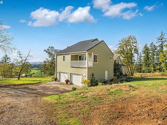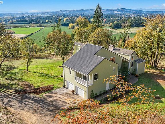 Nestled on 20 private acres in Newberg’s renowned wine country, this custom-designed home showcases breathtaking territorial views at every turn. Step inside to enjoy a light-filled, open floor plan with soaring ceilings and beautiful hardwood floors that add warmth and charm throughout. The inviting living and dining area, complete with a cozy wood-burning fireplace, creates the perfect ambiance for intimate gatherings and holiday celebrations alike. At the heart of the home is a chef’s dream kitchen, offering abundant storage, generous counter space, a large island, and a cozy nook ideal for sharing meals and creating memories. The large windows let you take in the view of the countryside & invite the beauty of the outdoors inside. Upstairs, the oversized primary suite serves as a private retreat, with high ceilings, ample windows for natural light, dual sinks, a built-in jacuzzi tub, and a spacious walk-in closet. Three additional bedrooms await, one featuring its own private deck, along with updated bathrooms, new carpeting, and fresh interior paint. Recent upgrades include leaf guard gutters, new windows, Hardie plank siding, a new septic system, a new HVAC system, and new garage door openers, ensuring comfort and convenience. Just minutes from the best that Oregon’s wine country has to offer, this home is the ideal place to enjoy your morning coffee or take in a stunning sunset, surrounded by beautiful views and endless potential.