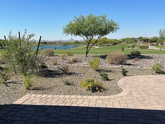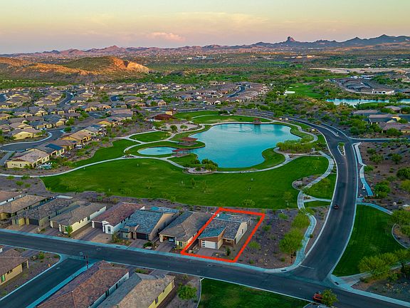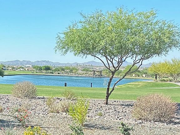 Yes, this is your back yard!! A brand new, never lived in home is loaded with extras ($140,269 upgrades). Location, location!! .....Corner lot with open space next to back and side yards and green space across both streets...only one neighbor. The large extended back patio is where you can enjoy the fabulous views of Lake Park and the lake while gazing at views of the mountains and Vulture Peak. The front door offers keyless entry into the beautifully tiled hall, pass by the glass office doors and then into the open great room. You'll marvel at the upgraded backsplash with under cabinet LED lighting and quartz countertops. This Gourmet Kitchen package includes GE Profile stainless steel appliances, 42''upper cabinets with easy close hinges, soft close drawers, rollouts and built in rec recycle center. The island is accented with three pendent lights, upgraded sink and faucet. Enjoy your great room with surround sound, Audio video sleeve for wall mount tv and the massive 15ft three-panel glass wall leading to your outside living space and the incredible view. When you enter the master suite you will note the highly upgraded shower with ceramic tile walls and floor, built in seat, handheld shower, grab bar and extra heavy glass enclosure. From there you will notice the large mirror, dual sinks and quartz countertop, private toilet room and large walk-in closet. The guest bath features ceramic tile/shower, and a Kohler raised toilet. All rooms and patios are pre-wired for you to add your personally chosen ceiling fans for ultimate comfort. This amazing home offers added insulation to interior walls, garage walls and garage ceiling. The 4ft. extended garage has a laundry tub and outside access door. Landscaping is installed with automatic watering system and is prewired for yard lighting. You need to see to appreciate the many more items that make this home special.