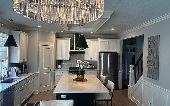 An inviting open-concept floor plan creates a seamless blend of gathering and private spaces. The gourmet kitchen showcases a luxury custom hood, lighting, premium cabinetry, quartz countertops, and an extra-large island perfect for entertaining. The great room, with its sophisticated ceilings, built-ins, and warm natural light, offers the ideal backdrop for both quiet evenings and lively gatherings. A beautiful Executive office sets the tone for any professional meeting.