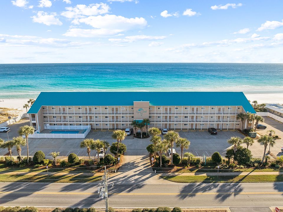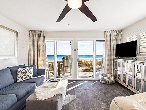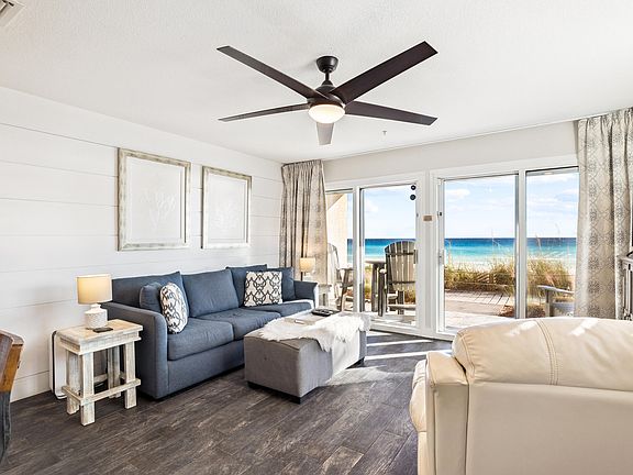 Welcome to Crystal Sands, a beautifully updated Gulf-front condo offering effortless coastal living and unbeatable convenience. Perfectly positioned on the first floor, this private corner unit lets you skip the elevator and step directly onto the sugar-white sand. Inside, the open kitchen shines with crisp white cabinetry, granite countertops, and stainless steel appliances, creating the perfect space for cooking up beachside breakfasts or entertaining after a day on the water. The kitchen flows seamlessly into the inviting family room, where shiplap accents add coastal charm and two large sliding glass doors frame stunning Gulf views. Step outside to your private patio and enjoy front-row access to the emerald watersideal for morning coffee, sunset cocktails, or simply unwinding with the sound of the waves. The owner's suite offers a peaceful retreat with a shiplap feature wall and a newly remodeled en suite bathroom featuring a glass-enclosed tile shower that extends to the ceiling, a granite-topped vanity, and a convenient stackable washer and dryer. The double-entry bath design provides a private sink area for the owner's suite and a separate area for guests. Down the hall, built-in bunks add extra sleeping space, making this home a comfortable fit for family or guests. Crystal Sands is a highly sought-after Gulf-front community along Old Highway 98, featuring a sparkling pool, generous beach frontage, grill area, green space, and on-site management. With only 85 total units, residents enjoy low-density beachfront living where the sand is just steps from your door.