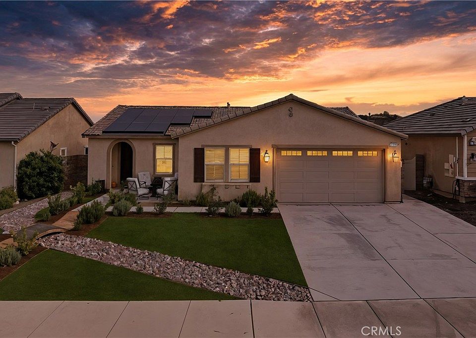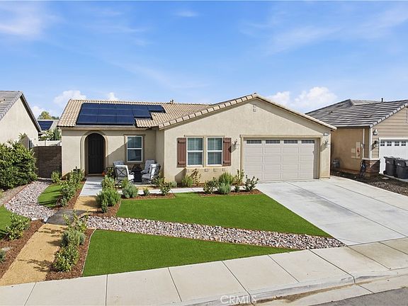 Beautiful single-story home in Menifee—perfectly upgraded and truly move-in ready! 4-bed, 2-bath home offers great curb appeal with drought-tolerant landscaping & turf,. The expanded concrete driveway offers more space for parking and the front patio is great for relaxing. Inside, enjoy brand new fresh paint throughout, brand-new carpet in all bedrooms, and LVP flooring in the main living areas. The open kitchen features a large granite center island, lots of cabinets, pantry, large stainless basin sink, recessed lighting and an ideal layout for gatherings. The master suite includes a private bath, dual sinks, walk-in closet and a custom shiplap accent sound wall for a modern touch. A sprawling backyard offers lush turf, landscape lighting, vinyl fencing and a freestanding gazebo for outdoor relaxation. Additional upgrades include 8' garage door and entry door, epoxy garage floors, an upgraded exterior side garage door and a tankless water heater. Located on a cul-de-sac, walking distance to sports park, tennis, playground, walking trails and more! LOW HOA! Priced to sell—don’t miss this Menifee gem!