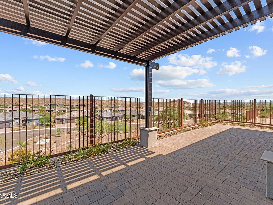 A dramatic wall of sliding glass doors frames sweeping views of the desert mountains, creating a picturesque backdrop for everyday living. Step outside to an expansive patio designed for year-round enjoyment. The partially covered area offers shade and comfort, while the charming pergola provides the perfect spot to dine al fresco or unwind while taking in the breathtaking scenery.