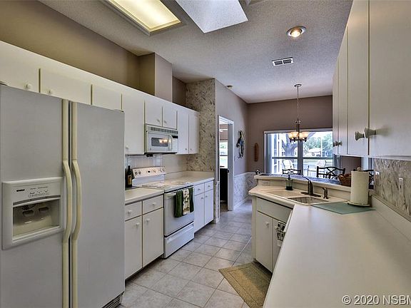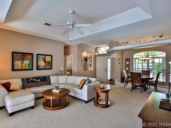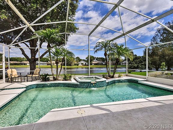 Immaculate Waterfront Home with gorgeous waterfall pool is professionally landscaped w/tropical foliage & palm trees and located in 24/7 secure, prestigious Spruce Creek Fly-In. This freshly painted 3 Bedroom 2 Bath home includes an open floor plan with ceramic tile floors & neutral decor. Great Room was built for entertaining, has tray ceiling, built-in ceiling speakers w/audio control & sliding glass doors to the Pool. Lanai offers an attractive pool area plus a gorgeous view of the Lake & Fla Sunsets. Open Kitchen has a snack bar & casual dining area with views of pool & lake. Master suite has architectural feature above bed, walk-in closet & also has sliding glass doors to pool. Master bath features dual sinks, separate tub & shower. Add'l features include Laundry Room w/Washer & Dryer, lots of closet space, 2-Car Garage & Irrigation System. Enjoy fishing? Catch bass in your backyard lake. Spruce Creek Fly-In annual assessment of $1550 includes 24/7 security, maintenance of airport, taxiways, streets, parks & common areas. This community offers it all! Residents can literally fly home to their private gated airport community, golf, play tennis or pickle ball, dine at their country club then drive a few miles & frolic on the gorgeous sand & surf of the World Famous Daytona Beach.