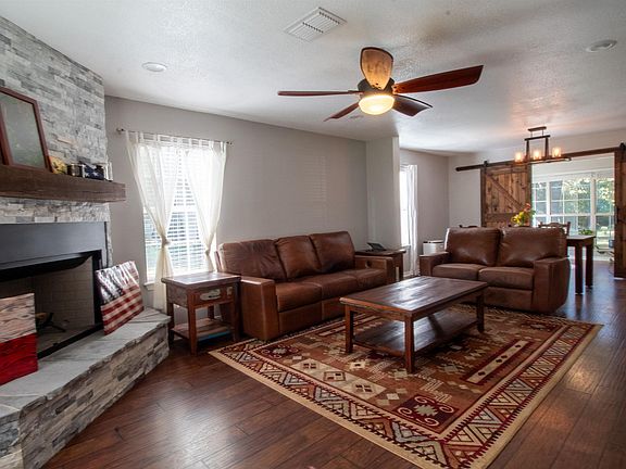 Nestled on 3 acres of fully fenced and cross-fenced land, this charming country home offers both privacy and practicality. The property features a spacious attached 2-car carport, as well as an additional detached 2-car carport with convenient storage space. Inside, the master suite is located on the main floor, complete with a master bath and a generous walk-in closet. The kitchen boasts granite countertops, a walk-in pantry, and stainless steel appliances, all flowing seamlessly into a large dining area and an open living room, where a wood-burning fireplace adds warmth and character. Wood floors extend throughout the home, complemented by decorative lighting that enhances its inviting ambiance. A sunroom offers tranquil views of the expansive acreage. Upstairs, two additional bedrooms share a guest bathroom, providing ample space. This property combines rustic charm with modern comforts, call today for a private tour.