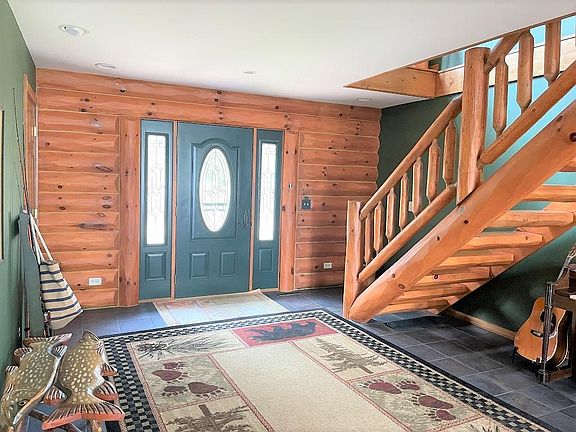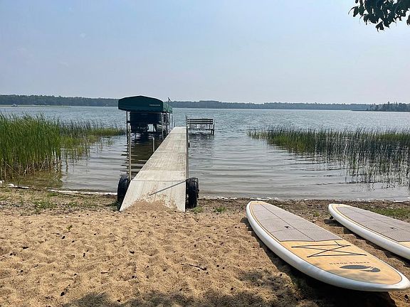 Two Inlets Lake - This is the property you have been waiting for with the level lot, sand shoreline, pines, log sided with lake views from every room. Main level with primary bedroom and full bath, vaulted ceiling in living room with wood burning fireplace, and Siberian hardwood. Large kitchen with granite countertops, spacious work area along with dining room having to lakeside patio. Upper level has two large bedrooms plus full bath and office/den area with views of lake and front yard. Home has also been recently stained and new electronic shades installed in bedrooms. Call for your private showing today!