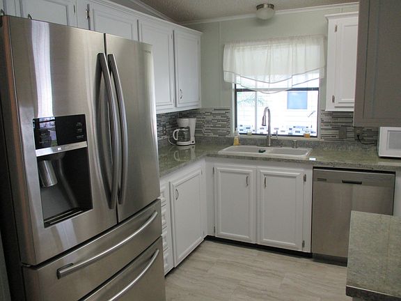 This home includes the following features: shingled roof, vinyl siding, drywall ceilings, papered walls, electric heating, carport, storage shed, gutters, patio, cathedral ceiling, ceiling fan, skylight, central air, walk-in closet, laundry room, pantry, sun room, microwave, oven, refrigerator, dishwasher, clothes washer, clothes dryer. Enjoy this JACOBSEN Home, which features a remodeled kitchen in 2015 with top of the line appliances, breakfast bar, countertop and back splash that is breath taking. The fully furnished home features 2 Screened In Porches, one off the front and one on the side. Enjoy the beautiful landscaping with the well maintained yard. Learn more about this affordable beautiful home in our active 55+ community.