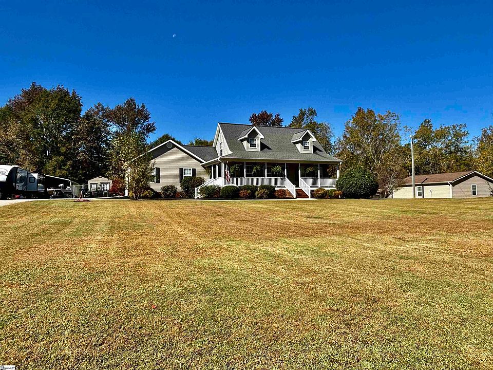 What an amazing home in the country that is only 20-25 minutes from Greenville,  Easley or Anderson.  The owners have updated many aspects of the home and it really shows.  Fresh paint and new carpet are the most recent updates.  The floor plan is great with the primary bedroom on the main floor and two exceptionally cute bedrooms upstairs that share a hall bath.  The excess light provides a cheerful feeling in the home and the outdoor spaces will impress anyone who loves the outdoors. You can split time enjoying the rocking chair front porch or sit on the covered deck out back looking over both expansive yards. The entire back yard is fenced!  If you have a boat or a camper the extra carport will come in super handy beyond a wonderful two car attached garage.  The small outbuilding does not convey.