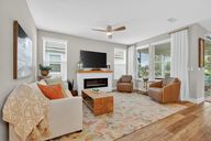 Custom linear fireplaceScreened lanaiUpdated lightingCustom wall detailLarge dining islandQuartz countertopsWaterfall faucets