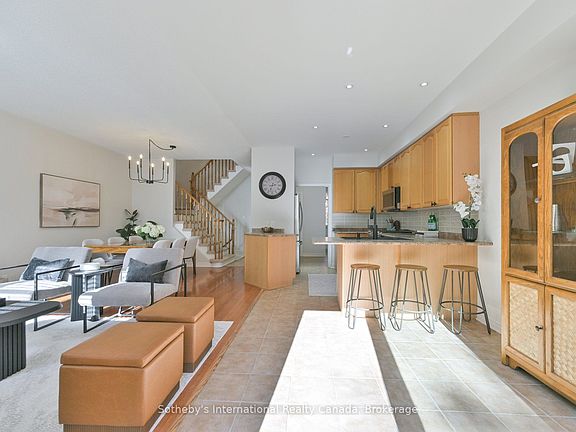 Nestled against the scenic backdrop of towering trees lies 319 Ravineview Way- a sophisticated 3 bed, 2.2 bath townhome with nearly 2500 sqft of living space and double car garage. Backing on to Oakville's famed Morrison Valley Ravine offering creek views with trail access steps from the front door. This location offers both lifestyle and tranquility. Enter the foyer to be greeted by 9 foot ceilings and an open concept main living area suitable for family living or entertaining. The large kitchen with breakfast area features stainless steel appliances and modern backsplash. The inviting living room with gas fireplace overlooks the backyard and is combined with the dining room. The sliding door walk-out to the sun deck with retractable awning features a grilling station and ample space for a lounge or dining set. Upstairs, the generous primary bedroom with large walk in closet and 5pc ensuite overlooks the ravine. Two other spacious bedrooms with double door closets overlook the front yard, while a 4pc washroom and linen closet complete this level. Head downstairs to the above grade family room with sliding door walk out to the backyard. With built in speakers and wired in for surround sound, this is the ultimate space for a family movie night or home office. With a rough in for a wet bar and space to add a shower to the powder room, this could also be the ideal in law suite. The washroom, laundry room and utility room all feature modern pocket doors while the workshop offers more storage. Outside, a covered patio off the lower level is a shaded retreat and the yard offers plenty of space for fun. Ideally located mere steps from trail systems, Postridge Park and Splash Pad, major shopping, dining and transit hubs. Enjoy the convenience of Iroquois Ridge High School and Community Center being a short walk away, plus easy highway access. This rare find is only 1 of 3 in the neighbourhood offering a double car garage with a walkout basement and ravine views. Don't wait!