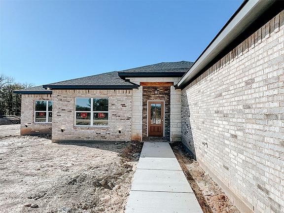 Welcome to your next chapter in Brock ISD’s Garner Ranch community — a stunning 4-bedroom, 2.5-bath new build on a 1.03-acre, tree-lined lot where traditional craftsmanship meets serene country living. With an all-brick-and-stone exterior, this 2,100 sq ft home blends timeless curb appeal with modern design and livability. Inside, soaring vaulted ceilings with elegant box beams anchor the open-concept layout, creating a warm and inviting flow throughout. The kitchen is a showstopper, featuring shaker-style cabinetry in a two-tone design with a richly stained island and lowers paired with crisp white painted uppers. Quartz countertops, stainless steel appliances, and a walk-in pantry complete the perfect mix of beauty and function. The spacious dining area flows effortlessly toward the covered back porch, which overlooks a private, wooded backyard accented by a charming seasonal creek—a peaceful setting for morning coffee or evening relaxation. This thoughtfully designed floor plan includes luxury vinyl plan throughout, four generous bedrooms and two and a half bathrooms. The primary suite offers serene backyard views and a tray ceiling that adds architectural character. The ensuite bath features a separate soaking tub and step-in tile shower with glass enclosure, dual sinks with quartz counters, and a large walk-in closet. Landscaping will feature a full sprinkler system, lush sod, and beautiful plantings to enhance the home’s curb appeal. Additional highlights include a large mudroom, full laundry room, and a 2-car garage. Estimated completion: November 2025 — ready to welcome its first owner home. Designed for comfort and built to impress, this Garner Ranch retreat pairs timeless materials with the natural beauty of its wooded, creek-lined setting—offering a truly elevated take on country living.