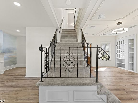 Refurbished fireplace frameTastefully updated kitchenDistinctive moldingsPlush carpeted center staircaseModern brushed gold hardwareOriginal high-quality cabinetryImported wall murals