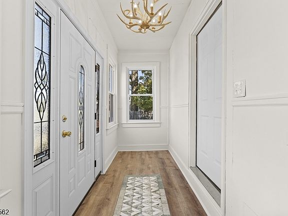 Step into timeless country elegance with this beautifully maintained circa 1900 residence, where classic charm meets refined design. The custom mosaic foyer introduces a sense of artistry and connection to nature, setting a warm and welcoming tone. Every element has been thoughtfully curated from imported wall murals to a bow window accented with golden flakes, designed to capture sunlight and create a captivating glow throughout the space. On the first level, find a gracious living room featuring a refurbished fireplace frame wrapped in a premium handcrafted mural, a subtle nod to the home's original hearth. A formal dining room with original built-in shelving and glass doors offers both charm and function, while a plush carpeted center staircase gracefully separates the two spaces. The main level also features a full bathroom, a convenient laundry area, and a tastefully updated kitchen that honors the home's heritage with original high-quality cabinetry, modern brushed gold hardware, and stainless steel appliances. Upstairs, find three bedrooms framed with distinctive moldings that lend each space its own personality, along with a second full bath showcasing floor-to-ceiling porcelain and minty glazed ceramic tiles. Outdoors, a charming playhouse with its own mailbox adds to the property's unique appeal and countryside character. With artistry, craftsmanship, and the spirit of Great Meadows woven throughout, this home offers a serene retreat ready to be cherished.