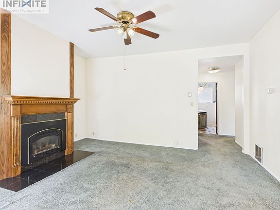 Step inside to find a cozy living room complete with a beautiful wood-trimmed gas fireplace and ceiling fan, ideal for relaxing year-round. The large eat-in kitchen features plenty of cabinet space, and oversized windows that let in tons of natural lightperfect for enjoying your morning coffee.