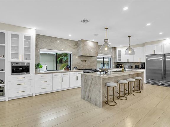 Stunningly remodeled, intracoastal front 6 bedroom, 6 bathroom home ready for you to move in. Every inch of this property as been transformed with the finest finishes. Beautiful foyer welcomes you into this 5,196 square foot masterpiece. Chef's kitchen is dressed with Cristallo Island, SubZero refrigerator and freezer, Wolf range, and wall espresso machine. The wet bar with wine cooler leads you to your open family room and formal dining room with incredible views of the intracoastal waterway. Summer kitchen for entertaining at your gorgeous pool overlooking 60 ft. dock. Fully equipped theater room + separate office on the first floor. Second floor has very large loft and coffee bar along with a fireplace. Primary bedroom boasts water views and extra large shower with dual shower heads. Stunningly remodeled, intracoastal front 6 bedroom, 6 bathroom home ready for you to move in. Every inch of this property as been transformed with the finest finishes. Beautiful foyer welcomes you into this 5,196 square foot masterpiece. Chef's kitchen is dressed with Cristallo Island, SubZero refrigerator and freezer, Wolf range, and wall espresso machine. The wet bar with wine cooler leads you to your open family room and formal dining room with incredible views of the intracoastal waterway. Summer kitchen for entertaining at your gorgeous pool overlooking 60 ft. dock. Fully equipped theater room + separate office on the first floor. Second floor has very large loft and coffee bar along with a fireplace. Primary bedroom boasts water views and extra large shower with dual shower heads.
