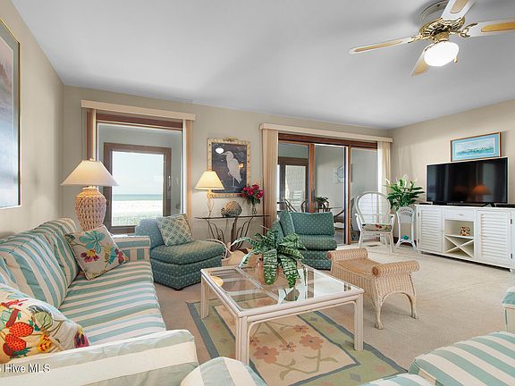 Experience breathtaking ocean views the moment you enter this beautifully furnished 3-bedroom, 3-bath oceanfront condo at Sun Bay Condominiums in desirable Pine Knoll Shores, NC. Complete with a versatile flex room and sold fully furnished with a few sentimental exclusions (see list in documents), this move-in-ready coastal retreat offers a bright kitchen that flows seamlessly into a spacious open living area—perfect for entertaining. The living room opens to a glass-enclosed sunroom and a spacious deck, both offering sweeping views of the beach and oceanfront pool. A tile entryway provides the perfect touch for sandy feet, while a guest bath and flexible bonus space add functionality and convenience. The first-floor primary suite features a walk-in closet, ensuite bath, and a private sunroom with ocean views that opens to a deck with direct access to the beach walkway and pool. Two additional guest bedrooms and a hall bath ensure plenty of space for family and friends. An oversized assigned parking area accommodates 3-4 vehicles if parked strategically, with overflow parking available on a first-come, first-served basis. A large exterior storage room keeps all your beach gear organized, and the well-maintained, low-density Sun Bay community offers elevator access, private beach entry, an oceanfront pool, and included basic cable and internet. Whether you're looking for a serene personal getaway or a prime investment opportunity, this exceptional unit is a must-see—schedule your showing today and start living the coastal dream!